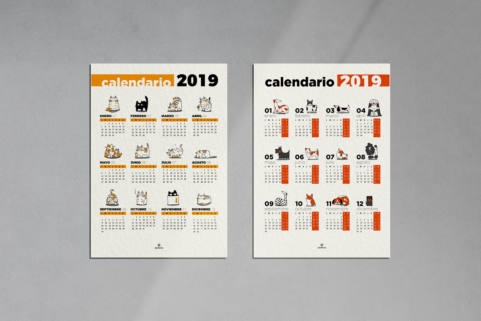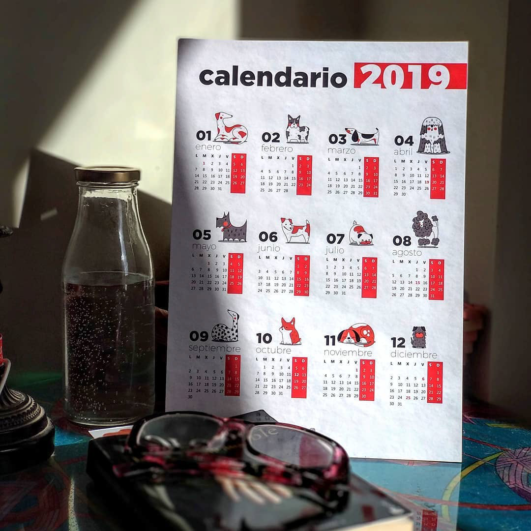 En 2019 creé 12 ilustraciones de gatetes y 12 ilustraciones de perretes con las que diseñé 2 calendarios (en diferentes versiones A4, A5 y A6) cuyos ingresos destiné a la protectora SOS Galgos.
