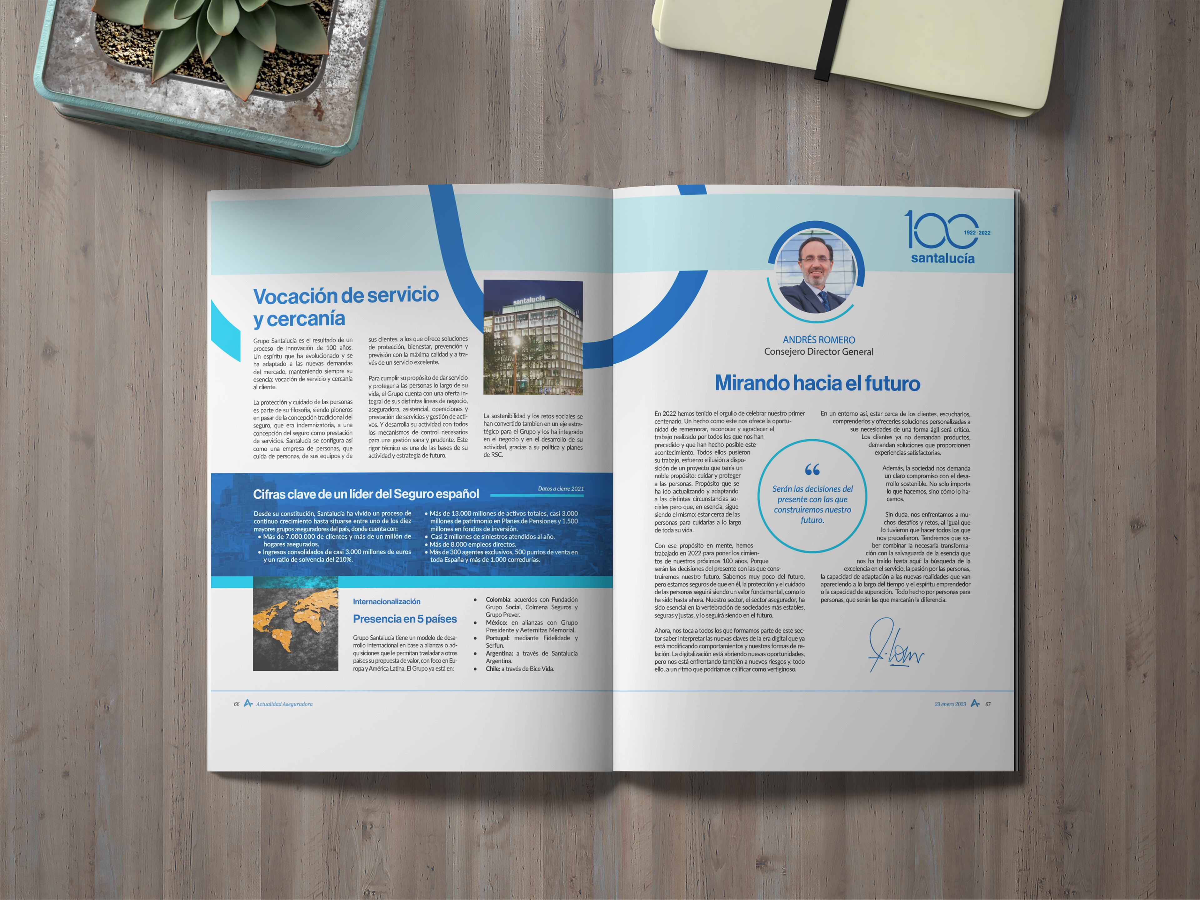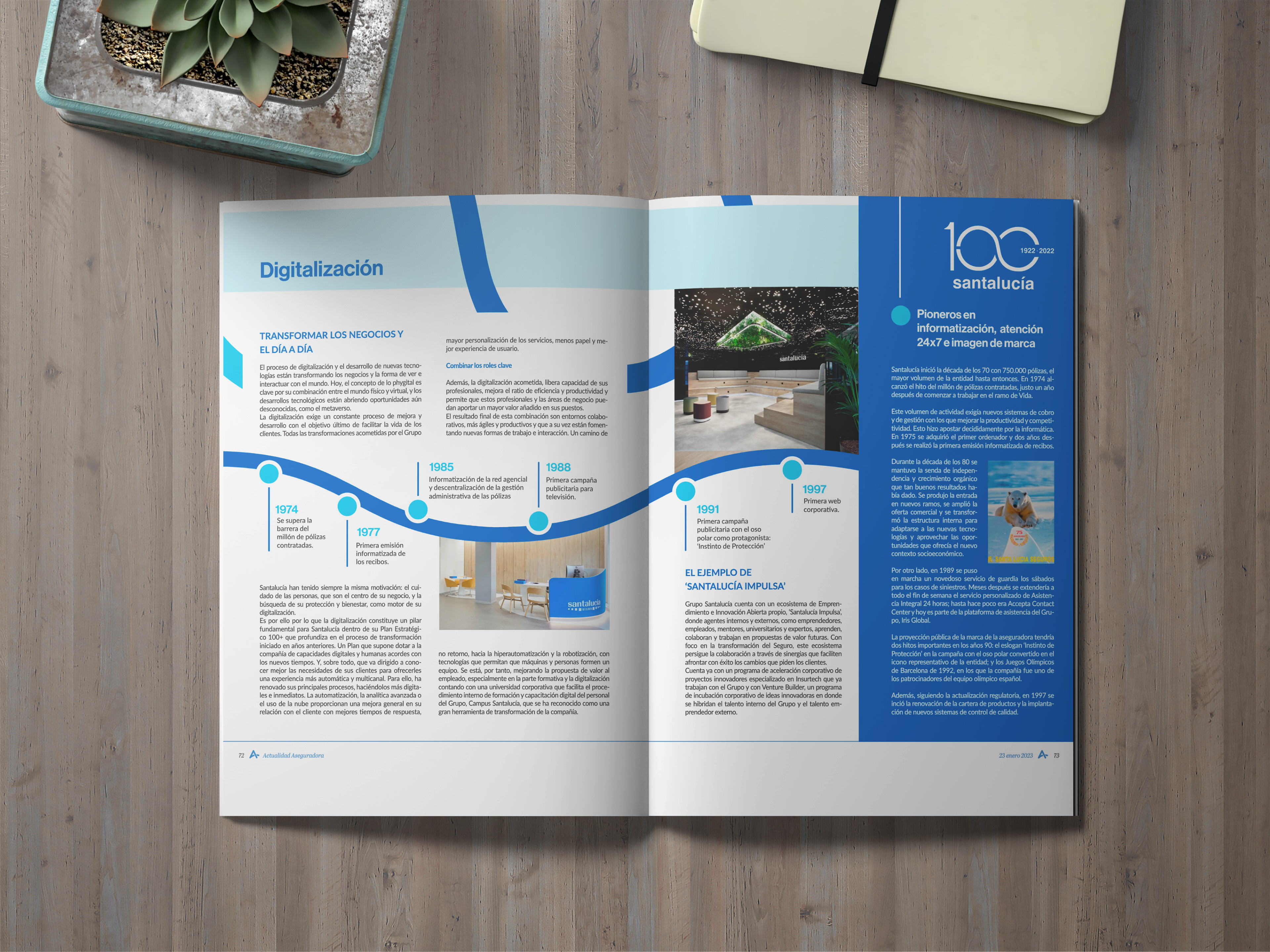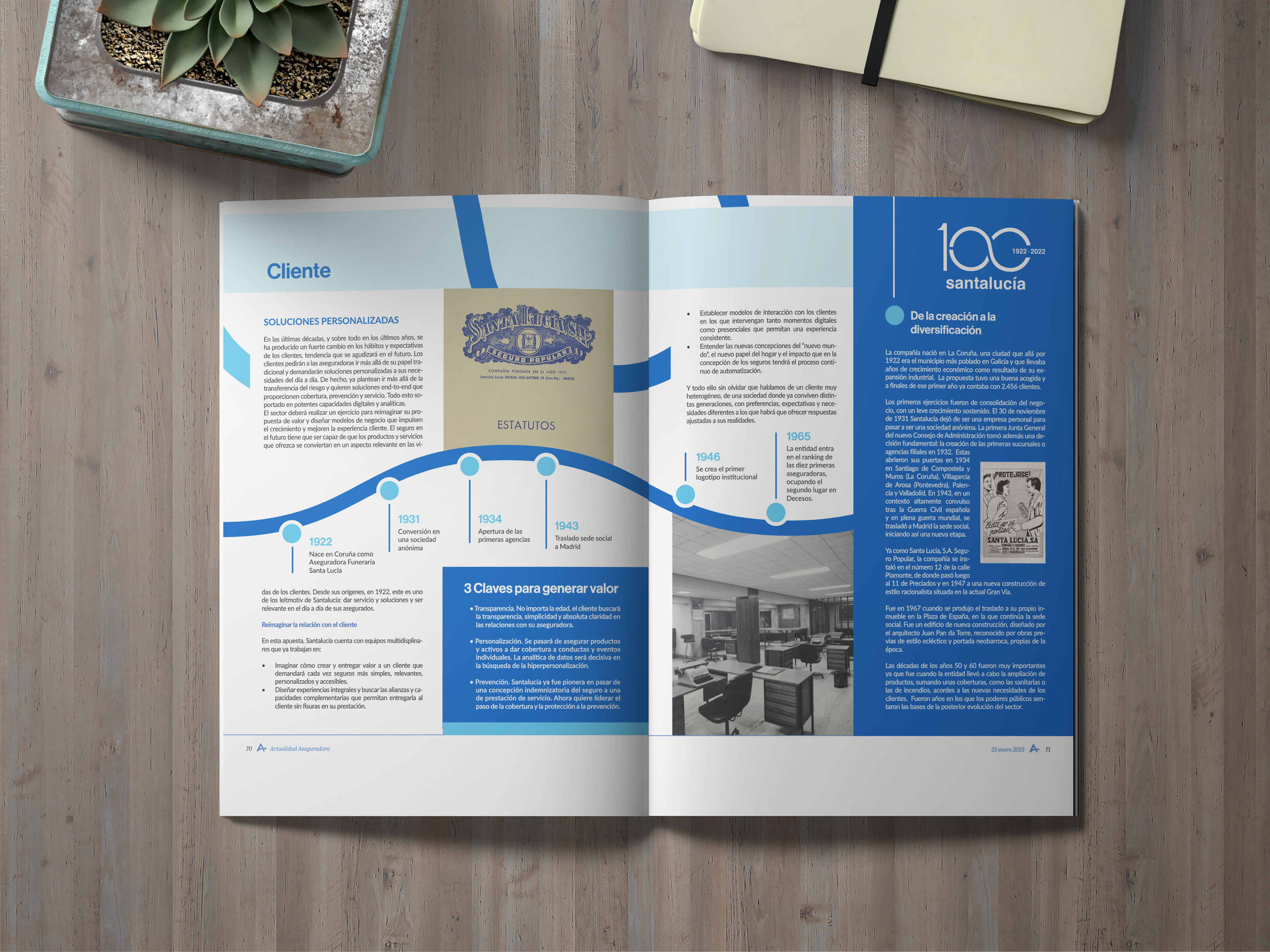 Diseño a partir de la identidad gráfica del centenario de Santalucía para la maquetación de sus páginas especiales en la revista Actualidad Aseguradora.