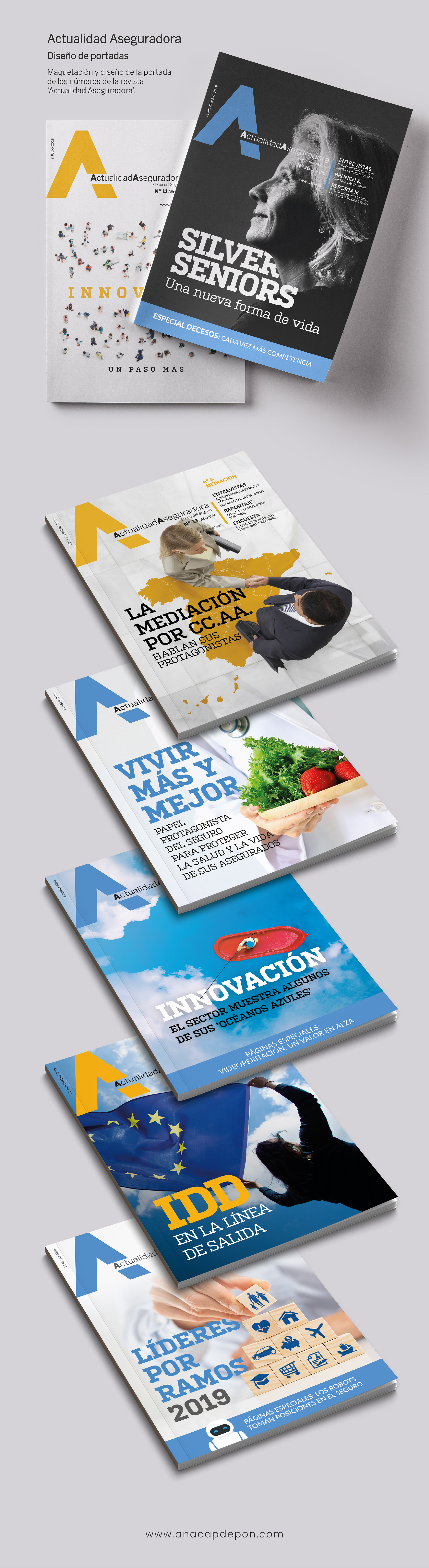 Portadas para los números de la revista 'Actualidad Aseguradora' (2019-2020).