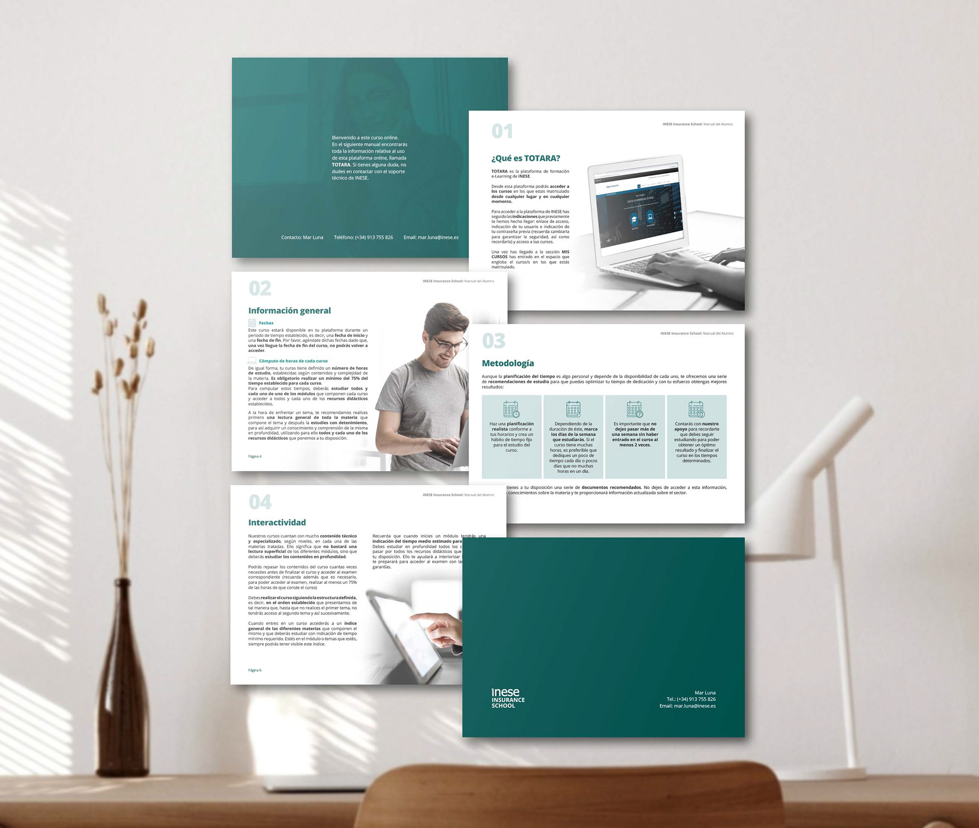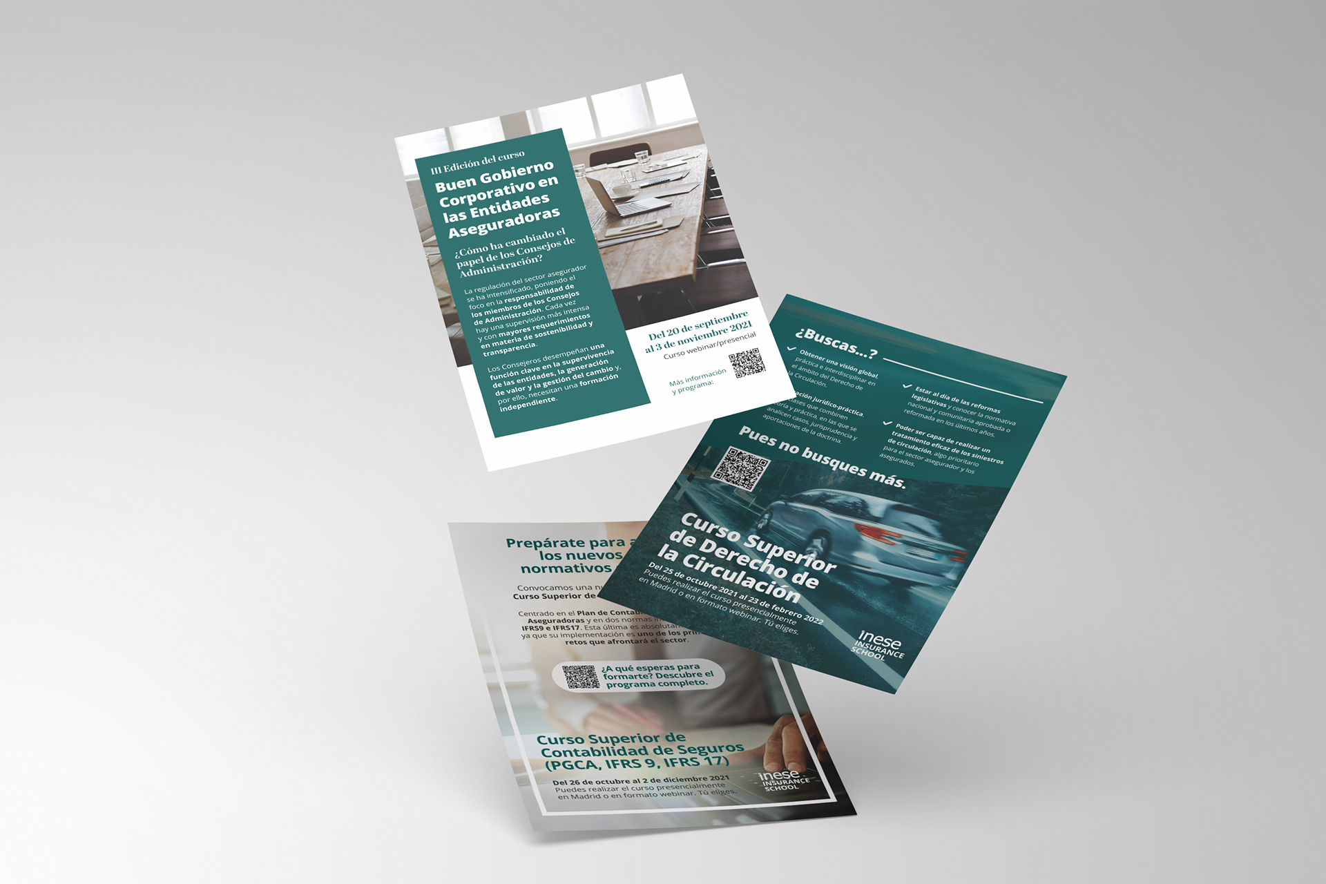 Diseño de materiales corporativos para INESE a partir de su identidad visual corporativa. Ejemplos: 1) Programa de formación The Good Mentor. 2) Anuncios de diferentes formaciones. 3) Programa de formación The Next Generation of Woman in Surance. 4) Presentación Manual del alumno.